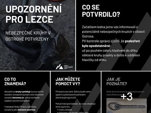 Kontroly jištění na některých cestách autora Karla Běliny v pískovcové oblasti Ostrov potvrdily obavy z nebezpečných kruhů. Informoval o tom Český horolezecký svaz (ČHS) na Facebooku. Podle správců skal se u části kruhů při testu dokonce po pouhém úderu kladivem oddělila hlavička od dříku.