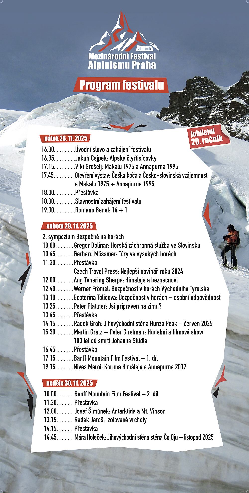 Mezinárodní festival alpinismu Praha 2025 začíná dnes od 16:30 v hotelu International v Praze 6. Dnes je na programu přednáška Jakuba Cejpka, kterému se letos podařilo zkompletovat sbírku výstupů na 82 alpských čtyřtisícovek, či otevření výstav: Češka koča + Česko-slovinská vzájemnost a Makalu 1975 + Annapurna 1995. Zde přinášíme podrobnější program:
