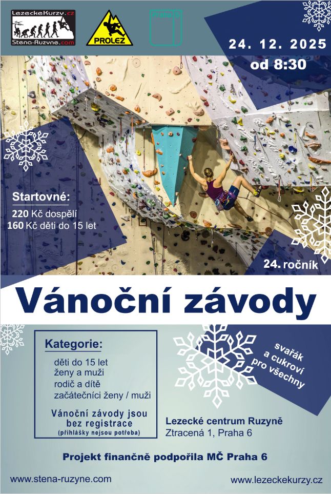 Chtěli bychom vás pozvat na vánoční závody 24.12. na naší stěně na Ruzyni v Praze. Závod začne od 8:30 a stěna bude otevřena do 14 hodin. Přijďte si s námi užít sváteční pohodu a k tomu si zazávodit a zalézt.