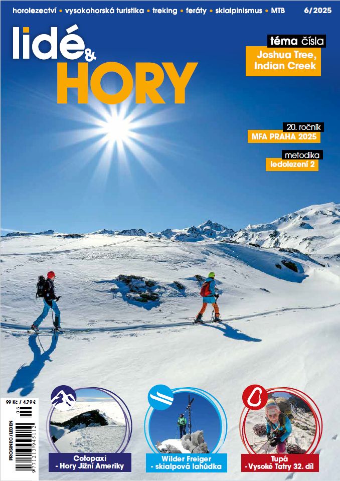 Poslední číslo letošního 24. ročníku časopisu lidé&HORY 6/2025 se distribuuje v týdnu od 15. prosince 2025. K nosným článkům čísla patří informace o úspěšném Mezinárodním festivalu alpinismu Praha 2025, dále pak reportáž o lezeckém tripu Marka a Petra Dismanových po národních parcích v jihozápadní části USA nebo rozsáhlé představení firmy Singing Rock formou rozhovoru s šéfem marketingu Janem Zámečníkem.