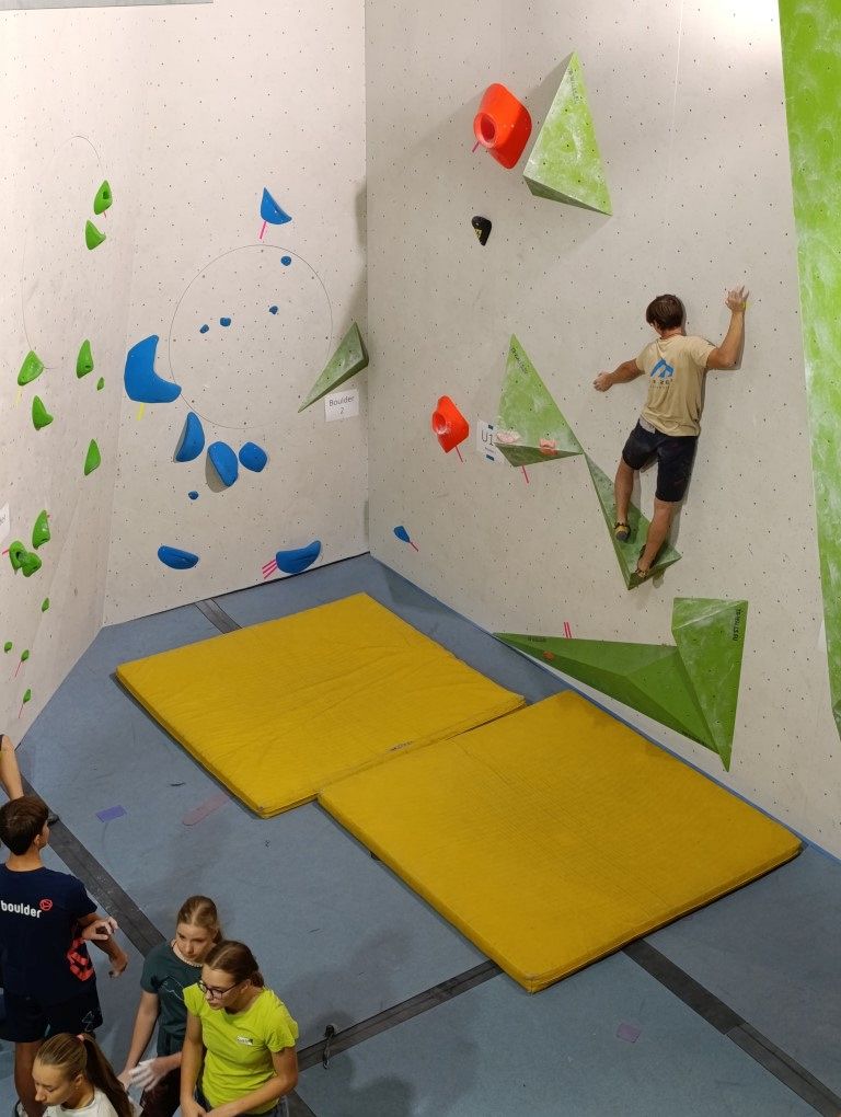 Spodní patro boulderu poskytlo ideální zázemí pro závodní prostory. Olča Stehlíková a Viktor Pařízek zde postavili sérii vizuálně poutavých, ale především technicky promyšlených boulderů, jež prověřily obratnost i sílu účastníků.