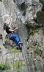 Nástup stejně jako cesta Preston, nad 2. nt doprava hladkou mírně převislou stěnou. Slaňák se houpe na hraně horního převisu.