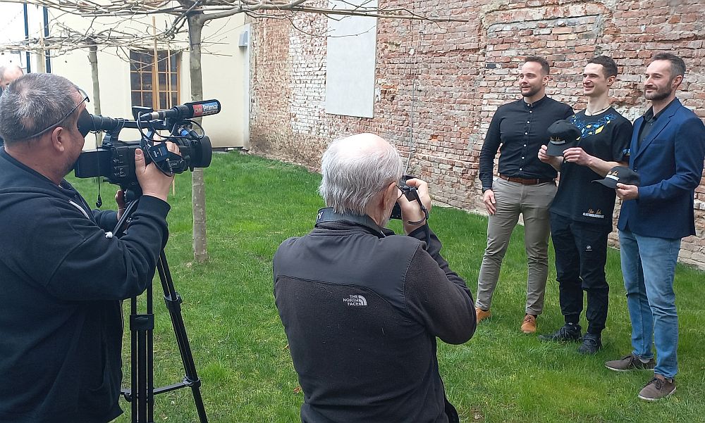 Adam Ondra, Petr Klofáč and Matěj Gosman pose for photographers at today's press conference