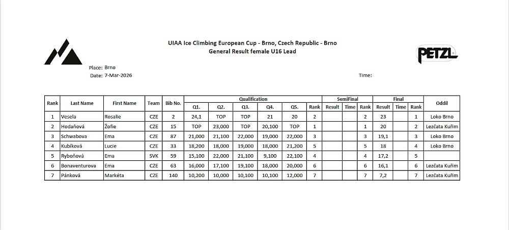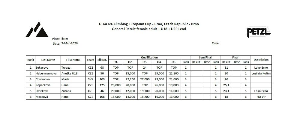 We would like to express our gratitude and look forward to the next round of the Czech Cup in lead ice climbing. We expect it to take place in the second half of October 2026. This competition will also be part of the nomination criteria for the national team for the 2026/2027 season.