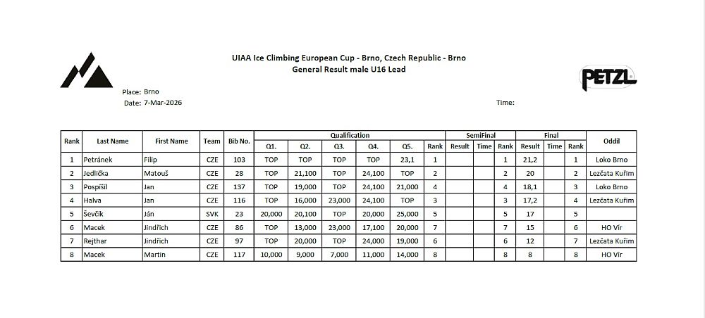 Unfortunately, this year there was a conflict with the last UIAA European Cup competition in Oulu, Finland, so some of the Czech competitors gave preference to this last international competition. In addition to the large number of adults participating (in this discipline), it is particularly pleasing to see the participation in the youngest category, U16, where 8 boys and 7 girls competed, confirming the growing interest of the younger generation in competitive ice climbing.