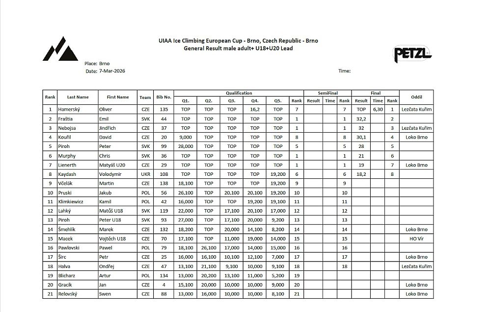 The competition was made possible thanks to the support of our partners PETZL CZ/SK, the city of Brno, the South Moravian Region, HUDY, and STATECH – plošiny, who have long supported the development of competitive ice climbing in the Czech Republic.
