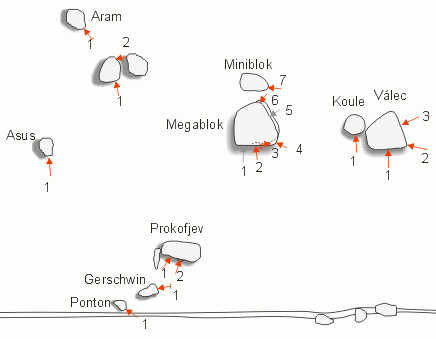 Bouldry končí (Proton, Gerschwin, ...) u odbočky se žlutou turistickou značkou. Po značené cestě ZEN (červeno-bílá), je v pravo možné se pohodlně dopravit k restauraci.