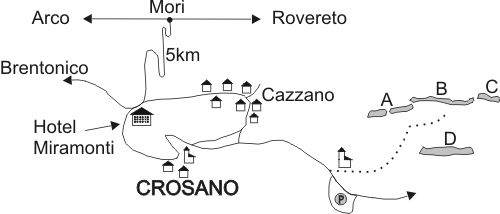 Z Arca po SS 240 směrem na Rovereto. Projeďte skrze Nago, Loppio a před tím než dojedete do městečka Moro odbočte doleva. Cesta se pak stočí dopara a překříží cestu na Rovereto. Pokračujte na Altopiano Brentonico-Monte Baldo až k hotelu Hotel Ristorante Miramonti (6,2 km). Zde opusťte hlavní silnici a vydej se klesající silničkou vpravo od hotelu ( směrem Crosano). Po asi 700 metrech dojedte ke kostelíku Cazzano (značeno falesia). Jeďte doprava se svažující cestou asi 1,7 km.